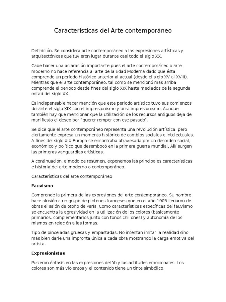 Fauvismo, expresionismo, cubismo, futurismo, abstracción, constructivismo, . Profesores de artes visuales plantean en escrito de tono ensayístico una visión de las prácticas artísticas contemporáneas. Ejemploseditar · arte digital · grafiti · arte postconceptual · neoexpresionismo · arte sonoro · transvanguardia · videoinstalación · crítica institucional. El arte contemporáneo no deja de sorprender. El término arte contemporáneo nos remite a una práctica actual y muy reciente.